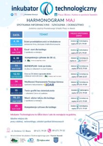 Maj w Inkubator Technologiczny w Iławie zapowiada się bardzo intensywnie. Przed nami miesiąc pełen spotkań, praktycznej wiedzy i inspiracji dla osób, które chcą rozwijać swoje kompetencje, planują własny biznes albo szukają nowej drogi zawodowej.